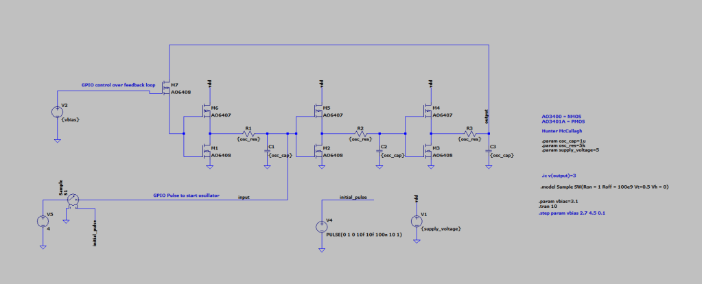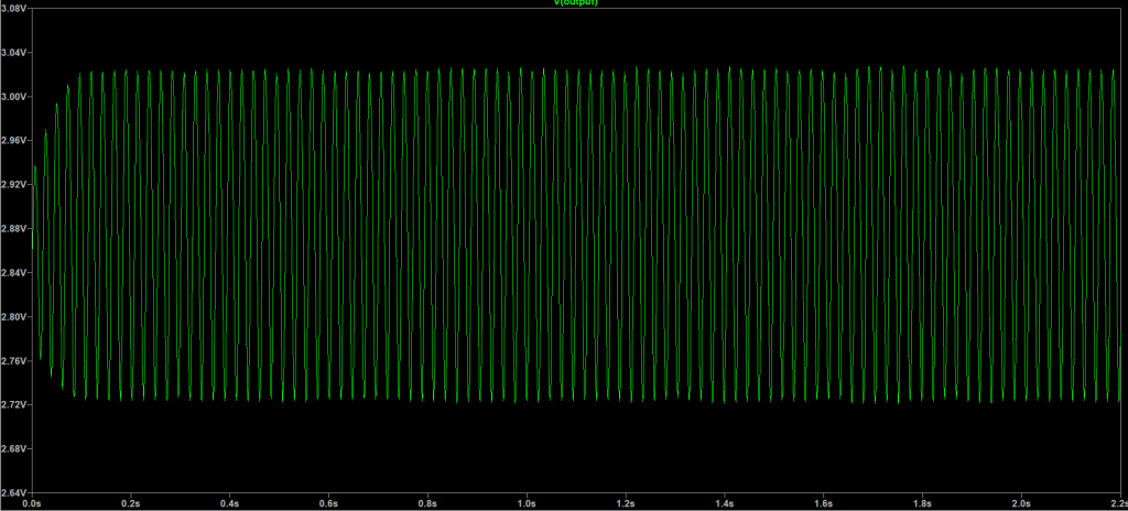 As seen in the transient simulation, the ring oscillator has an inconsistent sinusoid shape which causes unpredictability