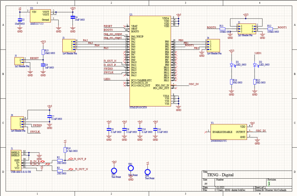 By using a ring oscillator circuit as a source of entropy works as this circuit it known to experience jitter. By sampling this with an ADC the randomness can be measured. An STM32 can also be used to communicate over USB with PCs